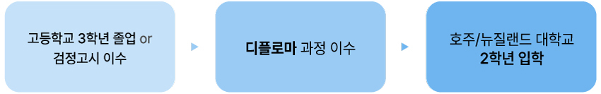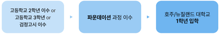 본과 과정으로 입학하기 전 진학 준비 과정으로 대학교 입학 조건을 충족하지 못한 경우 파운데이션 과정 이수 후 호주대학교 1학년으로 입학할 수 있습니다.