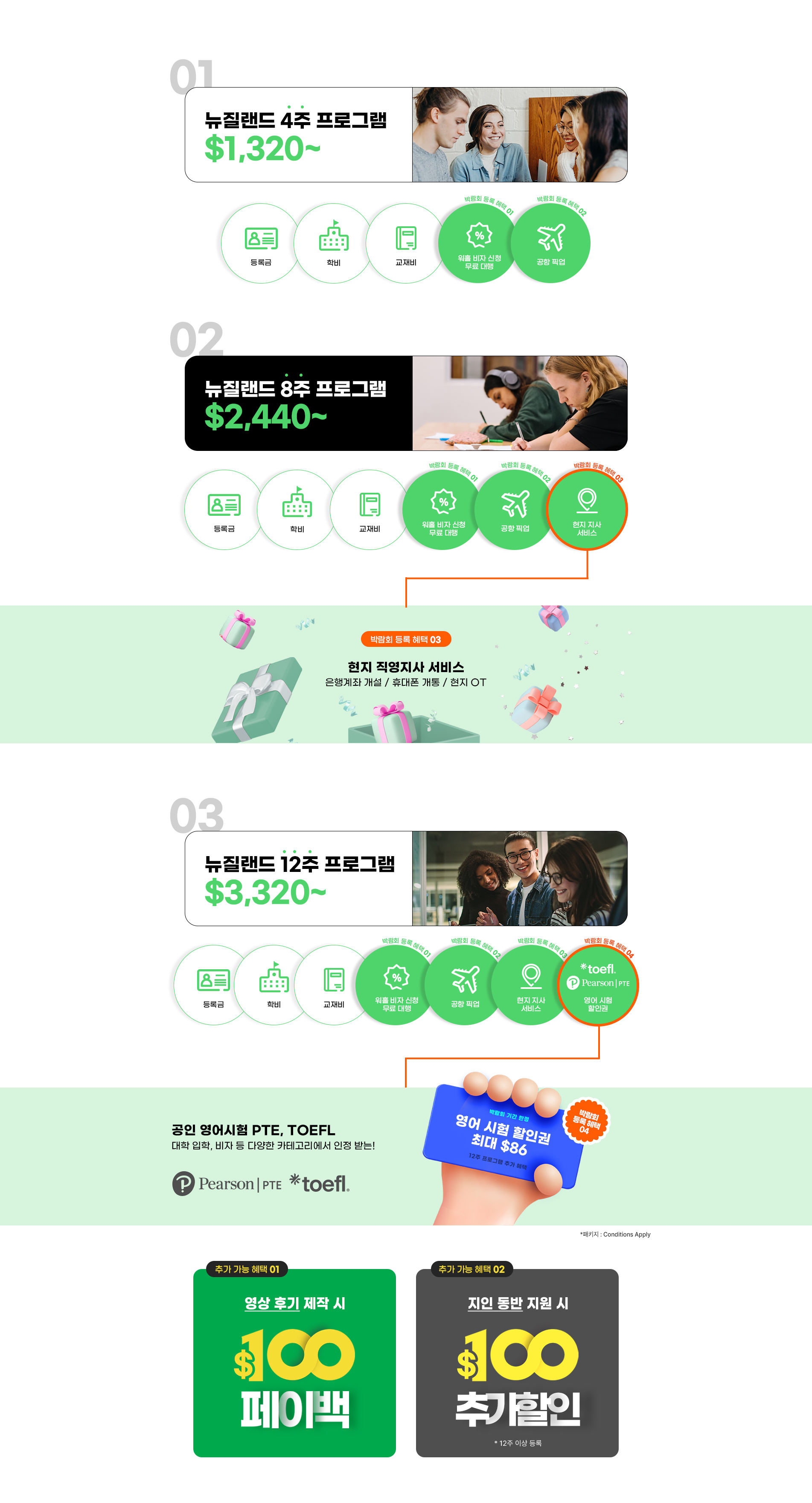 인턴쉽 기간 : 영어 과정 이후 6개월 이상 근무 조건 최소 영어 과정 기간 : 12주 최소 지원 영어 수준 : 중급 (Pre-intermediate 이상) 최저 시급 : NZ $23.50 보장 (세전) |